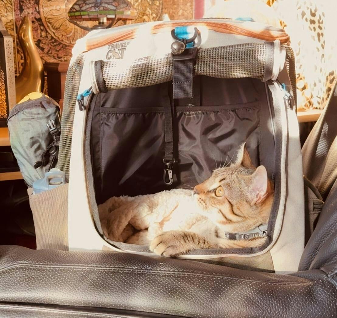 My seven month old Bengal kitten named Magic has found a new home away from home. The bag is roomy with good pockets and rides well on a bicycle, however, it would be nice to be able to attach additional stuff when hiking. Also, it would be nice to have a rain cover designed specifically for this bag with ventilation and portholes to see out, currently using a rain poncho just in case. Other than that, it’s a wonderful well-made cat backpack.